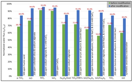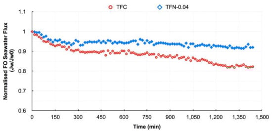 Ding et al. [84] employed hydrophilic aluminum oxide (Al2O3) nanoparticles as additives in both PSF support and polyamide layers to additionally create water channels in the substrate leading to increment in mass transfer and water permeability because they possess several advantages such as a high surface area, a large pore volume, and a high porosity. It was found that the addition of 0.5 wt.% Al2O3 NPs improved the substrate morphology, which involved high porosity (71.1%) and pore size (34.1 nm), hydrophilicity (67.7°), roughness (25.35 nm), and a finger-like structure was formed. Moreover, the structural parameter was decreased significantly from 1422 μm (pure PS substrate) to 1028 μm, which lead to lower ICP impacts. Moreover, the addition of 0.05 wt.% Al2O3 NPs to PA layer lead to higher roughness and thickness of the selective layer due to the formation of large “leaf-like” morphological structures and NPs aggregation. It was anticipated that the higher roughness, hydrophilicity, and large surface area of the active layer would result in high water flux and reduced salt diffusion. They also monitored that the modified TFN membrane demonstrated excellent FO performance and stability over long-term operation. In another study by Darabi et al. [85], ferrous ferric oxide (Fe3O4) nanoparticles were incorporated as inorganic nanofiller ranging from zero to 0.5 wt% into a PES substrate matrix because of its multiple benefits, including low toxicity, good biocompatibility, high surface area, chemical stability, and unique magnetic characteristics. The addition of 0.2 wt.% Fe3O4 to the substrate improves its main characteristics in terms of hydrophilicity (62°), porosity (87%), pore size (36.5 nm), cross-sectional morphology (longer finger-like structure), roughness (41.48 nm), and strength (3.12 MPa). This structure is preferred for FO membranes because it results in less resistance to the diffusion of water and salt and thus reduces unwanted the ICP effect of membranes. While Zirehpour et al. [42] established nano-sized metal–organic framework (MOF) particles from silver (I) and 1,3,5-benzene tricarboxylic acid. 0.04 wt.% MOF as a new category of organic/inorganic hybrid materials consisting of metal ions or clusters coordinated to organic ligands was added into the polyamide layer of membranes to improve the structure of TFC membranes for seawater desalination. This nanoparticle improved the active layer’s hydrophilicity and transport characteristics while not affecting selectivity due to the good affinity between the MOF and the PA layer. They also reported that the TFN membrane exhibited 129% higher pure water permeability in comparison with the TFC membrane as well as significantly improved performance stability throughout the testing interval. As shown in Figure 8, it was possible to see that during 1-day, the FO seawater flux declined by about 7% for the TFN membrane against about 18% for the TFC membrane which was primarily due to a decrease in driving force and fouling. It was observed from the above results that adding more or less than the optimal value of nanomaterials reduces the membrane efficiency because of the decreased membrane properties compared to the ideal membrane. In another distinction to reduce the effect of ICP, Wang et al. [99] incorporated multi-walled carbon nanotubes (MWCNTs) as potential fillers (i.e., in a range of 0–2.5 wt.%) into a PES substrate. They found that the nanocomposite substrate with 2 wt.% MWCNTs showed a desirable microstructure for promoting the separation properties of the FO process with respect to NaCl rejection rate (95%) and osmotic water flux (12 L/m2.h) and were higher than that of neat PES (78%, 8.2 L/m2.h) and commercial HTI membrane (89%, 9 L/m2.h), primarily due to the smoother, more open selective layer and more open interior pore structure. Moreover, the tensile moduli and strength of the substrates with MWCNTs are higher than that of the neat PES, which is useful for creating substrate supports without the need for fabric.