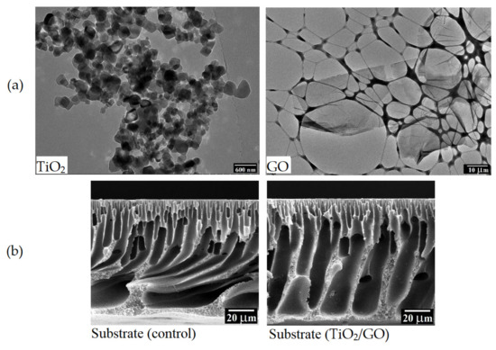 (a) Transmission electron microscopy (TEM) pictures of TiO2 and GO nanomaterial; (b) Scanning electron microscopy (SEM) pictures of a substrate (control) and substrate (TiO2/GO). Reproduced from reference [86] with permission from Elsevier (2017).