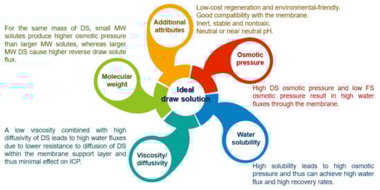 The osmotic agent, otherwise known as the draw solution (DS), provides the driving force of the FO process that plays an important role in an FO system efficiency [101], and it is responsible for absorbing water from feed solution (FS) through a semi-permeable membrane [102]. However, there is unanimous agreement that one of the challenges facing the future development of FO is finding an appropriate draw solution capable of significantly boosting FO performance. An appropriate draw solution not only promotes the efficiency of the FO process but also saves costs of the subsequent steps in recovering and replenishing the draw solute [103]. In selection, an ideal DS must be able to meet a variety of criteria to successfully drive the FO process, including being able to: (I) generate a high enough osmotic pressure; (II) have a low viscosity to facilitate easy pumping throughout the system and improved water flux; (III) have a low reverse solute flux (RSF); (IV) be available in large quantities at a reasonable price; (v) any toxicity of the draw solute will be a big concern if there is a chance that the finished product water may get contaminated [104]. Yet, Figure 10 highlights some important characteristics of a perfect DS that could impact FO performance. In the past few years, different draw solutions have been used in the FO process, and they can be classified into two categories: electrolyte solutions and non-electrolyte solutions; and evaluated in a search for an ideal draw solute. An overview of the recent advances in various draw solutions is demonstrated in Table 2.