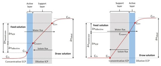 Both ICP and ECP may occur simultaneously in FO. Generally, ECP occurs near the surface of the active dense selective layer and ICP occurs within a porous support layer, both have two types due to the absence of hydraulic pressure: concentrative CP and dilutive CP, depending on the membrane orientation. Concentrative ECP (or CECP) and dilutive ICP (or DICP) occur when the active layer is facing the feed solution (AL–FS orientation, known as FO mode), while dilutive ECP (or DECP) and concentrative ICP (or CICP) occurs when the active layer is facing the draw solution (AL–DS orientation, known as PRO mode) [144] as shown Figure 12.