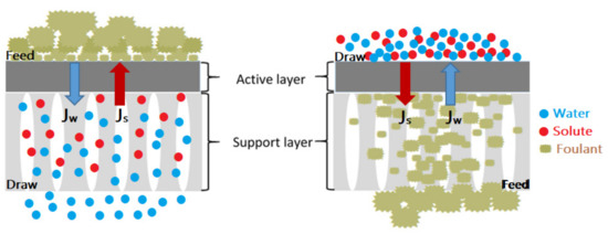 Like concentration polarization, membrane fouling is an inherent drawback for FO processes [129]. Its occurrence depends on a decrease in mass transfer (i.e., declined water penetration) which negatively affects the efficiency and lifetime of the membrane [101]. In Figure 13, membrane fouling in FO can be divided into external and internal fouling, it depends on the orientation of the membrane. At AL–FS orientation, fouling occurs on the active layer surface through the adhesion and adsorption of foulants, which enhanced cake/gel layer formation and causes external fouling. Whereas in AL–DS orientation, fouling occurs on or inside the support layer based on foulants size. If it is smaller than the pore size, it leads to pore clogging of the membrane or internal fouling, which enhances the hydraulic resistance and ICP effect. However, if it is larger, it leads to external fouling. Moreover, internal and external fouling may occur simultaneously when the feed solution includes different sizes of foulants [154]. To prevent pore blockage and a severe ICP effect, it is advised to employ the AL–FS orientation rather than the AL–DS orientation for the FO process [148,149].