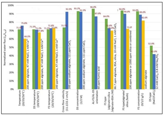 Temperature is regarded as an important physical parameter closely related to the physicochemical properties of FS and DS [107], and thus has a marked effect on reverse solute flux (RSF) [106], water flux [136], and membrane fouling [148]. A higher temperature will reduce the viscosity and increase the diffusion coefficient of the solution. These two factors can reduce the impact of ICP, and thus improve water flux [126]. Moreover, a temperature gradient occurs across the membrane when DS temperature rises, as it acts as an additional driving force that enhances mass transfer across the membrane [105,116]. Whereas the osmotic driving force is decreased when FS temperature rises, owing to a higher osmotic pressure at the feed side [136]. However, a further increase in temperature may lead to an increase in reverse salt flux (RSF) and consequently a decrease in water flux [141]. Some studies also found that raising the draw and feed temperatures produced almost identical water fluxes [142].