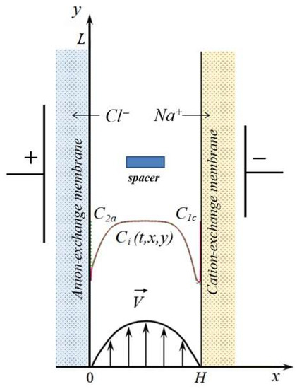 Scheme of a desalination channel formed between the anion- and cation-exchange membranes with a rectangular spacer. H and L are the width and length of the channel section. Schematically shown are the concentration profiles of cations (C1, solid line) and anions (C2, dotted line) in the desalination channel, the velocity of forced electrolyte flow at the inlet to the channel . is the anion concentration at the solution/anion-exchange membrane interface; is the cation concentration at the solution/cation-exchange membrane interface.