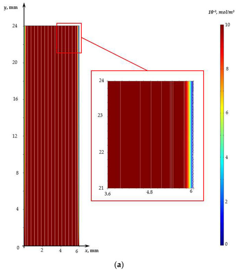 where the Nernst–Planck equations, shown in Equation (1), describe the flow of dissolved components (sodium and chlorine ions, respectively, charge numbers of cations , and anions ), due to migration in an electric field, diffusion, and convection [50,51,52,53,54,55]; Equation (2) involves material balance equations; Equation (3) is the Poisson equation for the electric field potential, Equation (4) is the current flow equation, which means that the current flowing through the diffusion layer is determined by the flux of salt ions: is the permittivity of the solution, is the Faraday number, is the universal gas constant, (V) is the potential, (mol/m3), (mol/(m2s)), (m2/s), (A/m2) is the concentration, flux, and diffusion coefficient of the i-th ion, the current density determined by the ion flux, and (m/s) is the solution flow velocity; the Navier–Stokes equations shown in Equation (5) and the continuity equations for an incompressible fluid, Equation (6), describe the velocity field formed, among other things, under the action of a forced flow and a spatial electric force (N/m3), where (C/m3) is the space charge density, (V/m) is the electric field strength, (kg/m3) is the density of the solution, and (m2/s) is the kinematic viscosity.