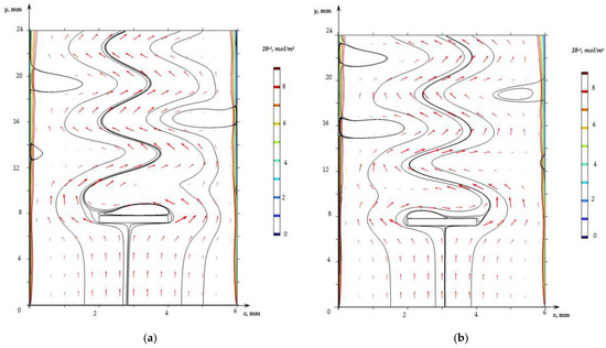 Electrolyte solution flow (black lines, arrows show the velocity field) and cation concentration distribution (colored level lines) for the desalination channel with spacer at time 170.65 s (a) and 170.70 s (b).