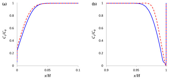 The vortices caused by the development of the Karman vortex street reach the surface of the membranes and affect the distribution of the ion concentration. Figure 4 shows that the thickness of the area of the desalinated solution at the locations of the vortices at a given moment (where the flow brings the “fresh” solution to the membrane surface) is less than in neighboring areas. Figure 5 shows the concentration profiles of cations in the cross section y = 0.85 L (regions near the surfaces of the anion- and cation-exchange membranes) calculated without a spacer (solid line) and with a spacer (dashed line) at time point t = 170 s. Figure 5 shows that the concentration of cations in the depleted diffusion layer near the surface of the anion- and cation-exchange membrane is higher in the case of the channel with a spacer due to the fact that the flow of the solution brings a more concentrated solution from the middle part of the channel to the diffusion layer near the ion-exchange membrane. At the same time, the periodicity of the change in the direction of the flow of the vortex street provides an increase in the electrolyte concentration near the surfaces of both membranes.