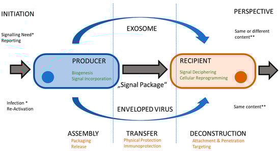 Comparing lifecycles. Both exosomes and virus particles transfer a package of signals from a producer cell to recipient cell. Cellular contribution (in green) and membrane functions (in orange) are similar, whereas initiating events (*) and perspectives (**) differ.