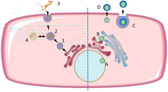 For both EXOs and EVIs, specific membrane compartments (as well as lipid rafts (LRs), tetraspanin-enriched membranes (TEMs), and detergent-resistant membranes (DRMs)) [38,39,40] play significant roles in biogenesis. The concept suggests that specific areas of the membrane are given a certain function, as represented by a different composition (i.e., an enrichment in cholesterol and sphingolipids). The existence of these compartments has been highly controversial due to small spatial dimensions and short half-lives [39,40]. Essentially, they provide a platform for assembly as well as for the entry of viruses (e.g., SARS-Co-V-2). Proteins that often associate with these membrane compartments include glycosylphosphatidylinositol-anchored proteins, Flotilins, and different G-protein-coupled receptor proteins. Tetraspanins commonly found in VEN are also enriched in membrane microdomains and play an important role in virus entry and exit [38]. The biogenesis of EXOs and EVIs may influence each other. Viruses are able to usurp the EXO biogenesis pathways and thus influence the secretion of exosomes [24,41]. The expression of the Epstein–Barr virus (EBV) LMP1 protein induced an increase in EXO levels compared to that not expressing this protein [42]. Similarly, the human papillomavirus (HPV) E6/E7 protein affects the level or EXOs in HPV-positive tumors [43].