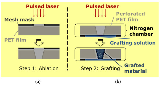 Sancaktar and coworkers recently introduced the use of the excimer laser for fabrication of stimuli-responsive membranes with polymer carrier films and hydrogel gating accomplished in the polymer pores fabricated by laser ablation [24,25,26,27,28,29]. The hydrogel is processed by using PLP, and the same excimer laser instrument can be used for both of these fabrication steps (Figure 2). This provides a highly efficient, fast, and accurate process that is superior to the existing membrane manufacture methods, including phase inversion, stretching, electrospinning, and interfacial polymerization.
