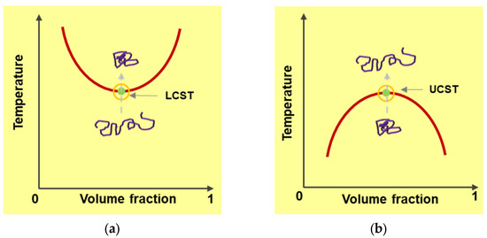 A polymer solution with a LCST starts to phase separate when temperature rises to its LCST (a). A polymer with UCST goes through the transition from insoluble to soluble state with increasing temperature approaching the critical point (b). Conformational transformations which occur during these transitions are also illustrated by darker color lines.