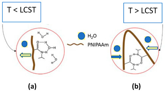 For temperature-responsive hydrogel with LCST, a phase transition takes place between the polymeric component of the gel and the solvent absorbed when temperature exceeds the LCST (T > LCST). Such polymer cross-linking becomes insoluble, leading to the deswelling of the hydrogel (Figure 4).