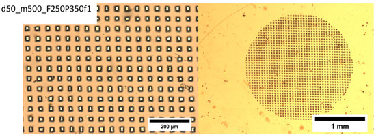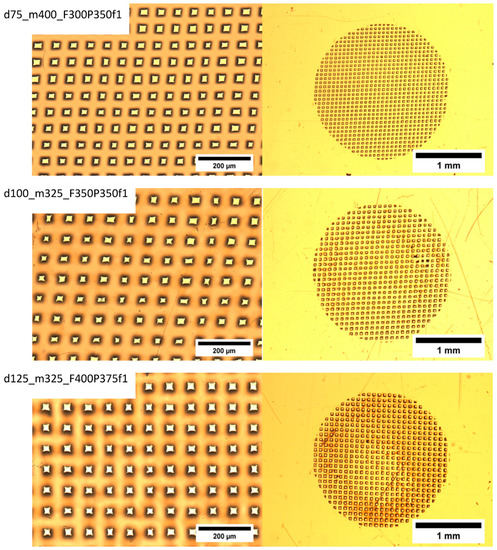 The following laser operation parameters are monitored during film ablation: F, fluence (energy/area) (mJ/cm2) (ablation threshold for PET ablated at 248 nm UV is 30 mJ/cm2), P, number of pulses, and f, laser frequency (Hz). Typical ablated films are shown in Figure 7 for different operation parameters (F, f), film thicknesses (d) and mesh sizes (m). The black areas surrounding the pores are laser heat-affected areas.