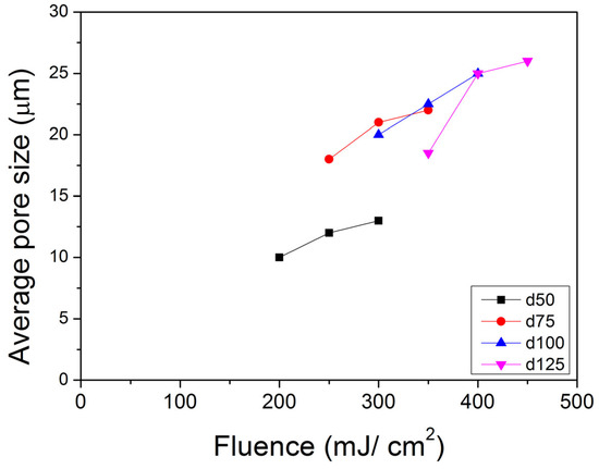 Work by Wu and Sancaktar [26] reported on the behavior of the average pore size (APS) vs. the number of pulses (P) of support membranes of four different thicknesses (d): 50 μm, 75 μm, 100 μm, and 125 μm. Each membrane thickness is studied under three fluence (F) levels by using four pores for each condition. Their results show that “pore open” P drops when F increases. Once the pores open, APS will remain almost the same. The final average pore size increases with increasing F, and more energy of the laser beam is needed to open pores for thicker films (Figure 8).