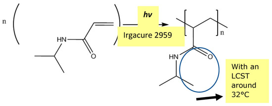 Thermo-responsive hydrogel poly(N-isopropylacrylamide) (PNIPAM) has a 32 °C LCST, which is very close to human physiological temperature, and as such, offers potential for biological and medical applications. The chemical structure of PNIPAM is shown in Figure 5. Hydrogen bonding between the NH groups (Figure 5) and any water molecules introduced transform the linear molecules into coil conformation below the LCST (Figure 4) [54,55,56]. At temperatures higher than the LCST, the conformation of the polymer chains transforms into folded globules owing to a strong hydrophobic effect caused by carbon backbone and isopropyl groups [54,55]. In PNIPAM aqueous solution, hydrophobicity of PNIPAM increases, leading to phase separation. As explained earlier, hydrogen bonding between the amide groups and water is weakened when higher molecular kinetic energy rising from increased temperature exceeds that for hydrogen bonding.