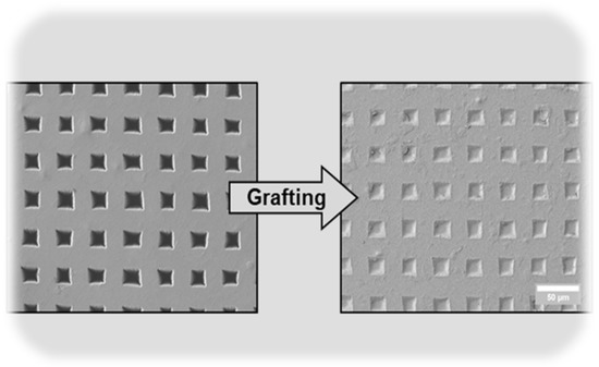 The pores created by laser ablation can be grafted with PNIPAM hydrogel by using the same laser to perform a bottom-up grafting-from type PLP (Figure 9, Figure 10 and Figure 11) at 5 mJ/cm2 in order to achieve the desired transport function controlled by temperature. O2 is removed from the grafting solution by bubbling N2 and from the grafting chamber by purging with N2.