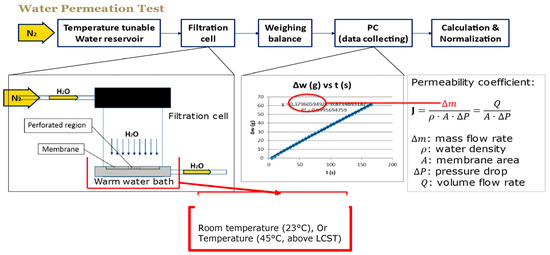 Wu and Sancaktar [26] determined the water permeability of membranes manufactured by using different grafting conditions with a filtration cell (Amicon 8010, Millipore, Burlington, MA, USA) which was kept in a temperature–controlled water bath. A preheated water reservoir upstream of the cell was pressurized by a nitrogen tank between 0.034 MPa (5 psi) and 0.31 MPa (45 psi) depending on the degree of grafting. A balance weighed the outcoming water in order to calculate water permeability coefficient from the slope of the weight-time curve at 23 °C and 45 °C by using the equation
