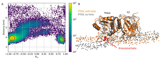 Initially, we focused on full-length PTEN and SHIP2. We have simulated these constructs previously [6], but we made new simulations for full-length PTEN to include an N-terminal helix in PtasePTEN, which was not modeled in the PTEN structure in ref [6]. Twenty-five coarse-grained simulations were performed on full-length PTEN with the N-terminal helix. The simulations were performed with an anionic membrane that mimics the inner leaflet of mammalian plasma membrane, as PTEN and SHIP2 bind to this membrane in vivo [6]. To map out the “binding landscape”, we plotted the center of mass–distance from membrane to C2 domain against Rzz. Rzz is the zz-component of the rotation matrix with respect to a reference structure, in this case, the last frame of the first repeat. Thus, Rzz represents a difference in binding orientation. Two binding modes were observed (Figure 2A), but only one was productive, i.e., with the catalytic active site of the Ptase domain in contact with the membrane [6]. The N-terminal helix contributed to the lipid binding in the productive binding mode by insertion into the lipid bilayer (Figure 2B). The productive binding mode was, however, very similar to the productive mode for simulations of PTEN without the N-terminal helix (Figure 2B) (from Ref. [6]), except for a tilt that allowed deeper helix insertion.