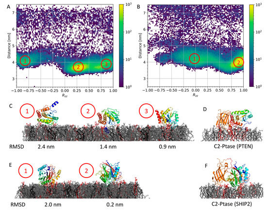From the CG simulations of full-length PTEN, we determined a productive binding mode, where the active sites of the Ptase domain were in contact with the membrane (Figure 2). Several frames from the CG simulations fulfilled that criterion (Mode 1 in Figure 2A), and the frame with the most frequently occurring values of Rzz, and protein–lipid distance was selected (yellow area in Figure 2A). The same approach was used to select the productive binding mode for full-length SHIP2 [6].
