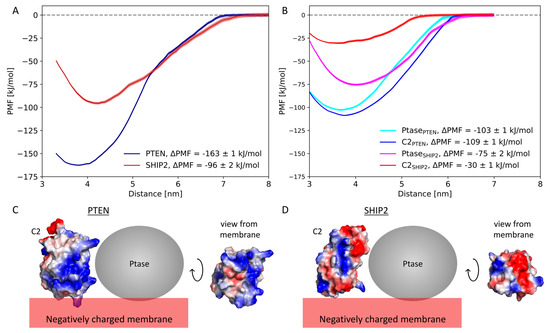 Binding energies as estimated by the potential of mean force: (A) Full-length PTEN (blue) and SHIP2 (red). Shaded areas show one standard deviation spread. (B) Ptase (light blue) and C2 (dark blue) from full-length PTEN. Ptase (purple) and C2 (red) from full-length SHIP2. Mean ± 1 standard error, estimated by bootstrapping [24]. Binding energy (ΔPMF) was defined as the difference between the minimum PMF value and the value in bulk. (C,D) Electrostatic surface of C2PTEN (C) and C2SHIP2 (D), with blue indicating positive and red indicating negative charge. Positions of the negatively charged membrane and the Ptase domains are indicated schematically.