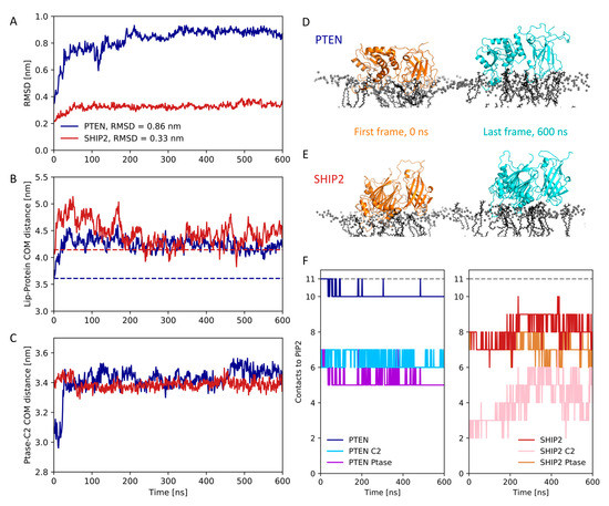 We converted the full-length binding conformations of PTEN and SHIP2 to atomistic resolution and performed a 600 ns all-atom simulation. That is, the initial positions were determined by the outcome of the CG simulations (as described in Section 3.3), which in turn started from randomized initial orientations. For PTEN, we observed an RMSD from the first to last frame of about 0.8 nm (Figure 5A). From visual inspection, this comes partly from loops being less compact (Figure 5D), but we also observed that the C2 and Ptase domains of PTEN shifted away from each other (Figure 5C). Moreover, the center of mass of PTEN moved away from the membrane by about 0.5 nm (Figure 5B), indicating less membrane insertion. However, the protein stayed bound throughout the simulations, and the number of contacts between both domains and PIP2s in the membrane stayed constant (Figure 5F). A contact is defined here as a minimum distance of less than 0.6 nm [27].