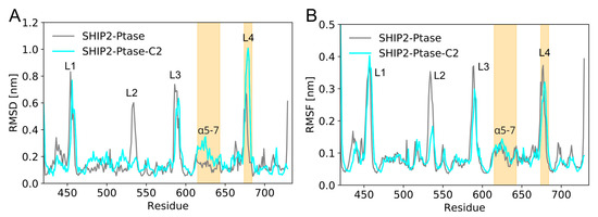 RMSD and the RMSF, averaged over the 600 ns simulation. RMSD were calculated with respect to the initial frame, which corresponds to the final coarse-grained binding conformation, converted into an all-atom resolution. Having had an elastic network applied during the coarse-grained simulations, the overall conformation of this reference structure is close to the initial crystal structure (PDB: 5OKM). Previous MD simulations showed that C2SHIP2 affects the conformation of the loop L4 (residues 674–684) and helices α5-7 (residues 615–643) of PtaseSHIP2 [10]. These simulations were performed without a lipid membrane, so we tested whether the results could be reproduced in the presence of a lipid membrane. Our simulations confirm this conformational change with SHIP2 bound to a membrane, as the RMSD of those regions vary in the presence or absence of C2SHIP2 (Figure 6A). We also confirm that loop L3 of PtaseSHIP2 (residues 587–594), which is in the interface between the domains, is less flexible in the presence of C2SHIP2, as shown from a decrease in RMSF (Figure 6B). However, C2SHIP2 does not change fluctuations of loop L4 and helices α5-7 significantly (Figure 6B), although this was reported in the simulations without a membrane [10]. Moreover, loop L2 of PtaseSHIP2 (residues 531–539) showed a strong reduction in fluctuations in the presence of C2SHIP2 (Figure 6B) in our simulations, as opposed to the simulations without a membrane, where the dynamics of L2 increased in the presence of C2 [10]. This is likely due to the fact that L2 is facing the membrane.