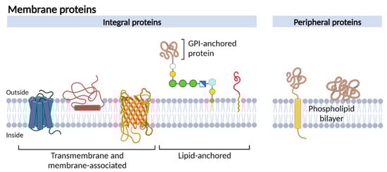 In every cell, a plasma membrane made up of a phospholipid bilayer separates the cells’ content from the outside. More than 50% of this membrane is decorated with special proteins that can be associated with the inner or outer side of the membrane or traverse the entire bilayer [1,2,3] (Figure 1). While the cell membrane provides an almost impenetrable surface for charged molecules, plasma membrane proteins facilitate well-regulated traffic of ions, water, or nutrients across the membrane, define the immunological identity of the cell, enable communication with the extracellular matrix, and participate in communication between the inside and outside of the cell [4]. Thanks to their unique features, membrane proteins have high potential as biomarkers. First, 30% of all human genome encodes for the different membrane proteins involved in almost all physiological processes [5]. Hence, their aberrant expression, differential modification, changed interacting partners, or malfunctioning is linked to many important diseases, including cancer [1,2,3,6]. Second, the extracellular domains of membrane proteins at the cells’ surface expose them to ready detection with probes and antibodies, or marking for imaging of the diseased tissue, for diagnosis, prognosis, or visualizing tumor boundaries to enhance precise dissection in surgery [7]. Third, they may also simultaneously serve diagnosis, imaging, and targeting purposes. For instance, human epidermal growth factor receptor 2 (HER2 or CD340) and epidermal growth factor receptor (EGFR) are readily accessible cell surface markers and specific docking sites for toxic drug-conjugated monoclonal antibodies. They facilitate high specificity and low toxicity treatment [8,9,10].