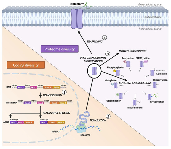 However, predicting the global membrane proteome from genomics and mRNA transcriptomics data is impeded by mechanisms that introduce further diversities to the genetic code at the mRNA and protein levels [30] (Figure 2). The genetic code is expanded at the transcriptional level when an RNA copy of the DNA is made by alternative splicing (or mis-splicing in pathological conditions) of mRNA, which generates multiple distinct isoforms of a protein [30,31]. After mRNA is translated into a protein, post-translational modifications in the form of covalent addition of functional groups to the protein or its proteolytic clipping introduce the next level of enrichment to the initial code [30]. Thus, the identification of clinically relevant membrane proteins’ proteoforms requires more direct approaches [32].