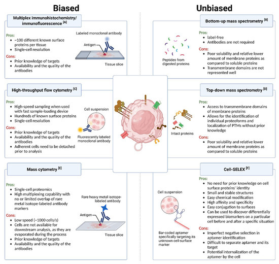 Cell-SELEX, the Systematic Evolution of Ligands by Exponential Enrichment, is an aptamer-based tool. Aptamers are short, single-stranded synthetic DNA or RNA molecules that can selectively bind to their targets, including proteins, peptides, and carbohydrates. Cell-SELEX adopts aptamers for screening the whole cell directly for its surface proteins without knowing what those proteins are. The selected aptamers are against the native form of the surface proteins and, hence, are directly relevant to cancer cell surface profiling [90]. In this procedure, the target cells are incubated with the starting pool of a single-stranded DNA or RNA library. After the oligonucleotides are bound to the positive cells, they are eluted by heat (positive selection) and are incubated—this time with the negative cells. Next, the unbound oligonucleotides from the negative cells (negative selection) were amplified by PCR to generate a new library for the next round of positive and negative selections, as before. At the end of about twenty selection cycles, aptamers are developed. After cloning and sequencing, the aptamers for a given cell type are obtained [90]. This strategy has been successfully applied to identify cancer cell surface proteins, especially when the tumor is aggressive and heterogeneous with no known surface markers [91,92]. Shangguan et al. successfully applied the Cell-SELEX method and identified the cell-specific surface proteins in tumor cells [91]. They first found five aptamers, with very low KD values ranging from 0.8 to 30 nM, against acute lymphoblastic leukemia (ALL) in cultured cells. These aptamers could then differentially identify different leukemia cells [91,93]. Then, they used one of the aptamers as bait, and through aptamer-based affinity purification and mass spectrometry analysis, they identified its target of one as a transmembrane receptor tyrosine kinase 7 (PTK7) [94]. In 2020, the same aptamer was used as a theranostic agent for hemato-oncological malignancies by Sicco et al. [95]. Other examples include the identification of differentially expressed membrane proteins of nasopharyngeal carcinoma cells [96] and pancreatic cancer cells [92], discriminating high-metastatic from low-metastatic cancer cells in colorectal carcinoma [97], breast cancer [98,99], osteosarcoma [100], prostate cancer [101,102], hepatocellular carcinoma [103,104,105], and colon cancer [106,107]. An in-depth review of the aptamer-based biomarker detection platforms and their application to various other diseases can be found in Huang et al. and Shigdar et al. [43,92]. A summary of the pros and cons of the biased and unbiased plasma membrane detection methods can be seen in Figure 3.