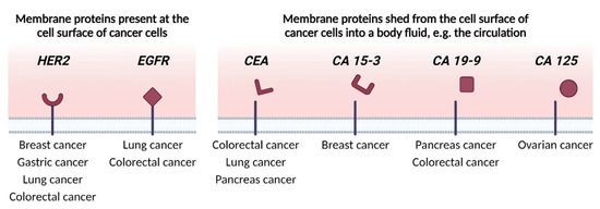 Examples of clinically used membrane proteins for the diagnosis, prognosis and/or treatment of different types of human cancer. Human epidermal growth factor receptor 2 (HER2) [115,116,117,118,119,120,121,122] and epidermal growth factor receptor (EGFR) [123,124,125,126] represent examples of membrane proteins that are present at the cell surface of specific cancer cells. Carcinoembryonic antigen (CEA) [127,128,129,130,131,132], cancer antigen 15-3 (CA 15-3) [133,134], cancer antigen 19-9 (CA 19-9) [127,131,135,136], and cancer antigen 125 (CA 125) [137,138] are (part of) the membrane proteins that are shed from the cell surface of cancer cells into a body fluid.