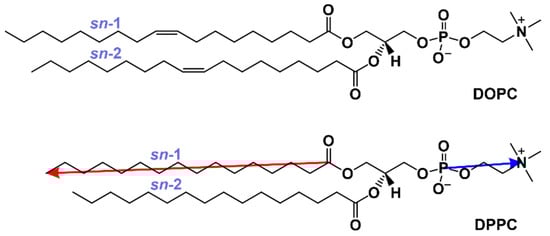 The miscibility of various PCs in membranes has been extensively studied using both experimental methods and molecular dynamics (MD) simulations. It is generally accepted that membrane composition, temperature, length, and the degree of unsaturation of the acyl chains are the most important factors affecting lipid miscibility. The experimental studies mainly focused on the determination of phase diagrams describing the boundaries between the different states of mixed PC bilayers. A number of methods have been used to construct the phase diagrams, including magnetic resonance and fluorescence spectroscopy, X-ray scattering, and differential scanning calorimetry (DSC) []. For example, X-ray scattering was used to determine phase transitions in mixed dioleoylphosphatidylcholine (DOPC)/dipalmitoylphosphatidylcholine (DPPC) membranes []. The phase equilibria of DOPC/DPPC-d62 mixtures in excess water have also been studied using 2H NMR techniques []. The results of these studies show that above the chain melting temperature of DPPC, fully hydrated mixtures of DOPC and DPPC are in the liquid crystalline phase at all compositions, which is characterized by rapid lateral diffusion of the molecular components, rapid axial diffusion of the molecules about the bilayer normal, and rapid lipid chain isomerization []. As the temperature is lowered, samples rich in DPPC enter a two-phase, gel–liquid crystalline coexistence region. The molecular motions are much slower in the gel phases.
