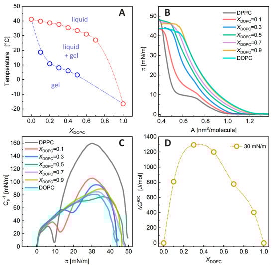 (A) Phase diagram of the DPPC/DOPC membrane determined using DSC. The melting temperature of pure DOPC was taken from ref. []. (B) Surface pressure (π)—area (A) isotherms for DPPC/DOPC mixed monolayers measured at 22 °C. Water was used as the subphase. (C) Compression modulus versus π for the DPPC/DOPC mixed monolayers at 22 °C. (D) Values of excess free energy of mixing (ΔGExc) as a function of the DOPC mole fraction (XDOPC) at π = 30 mN/m and 22 °C.