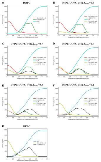 Mass-density profiles of lipids and selected chemical groups in lipid membranes at 295 K for DOPC (A), DPPC/DOPC with XDOPC = 0.9 (B), DPPC/DOPC with XDOPC = 0.7 (C), DPPC/DOPC with XDOPC = 0.5 (D), DPPC/DOPC with XDOPC = 0.3 (E), DPPC/DOPC with XDOPC = 0.1 (F), and DPPC (G). The density profiles of water (cyan curve), phosphorus atoms (green and black curves for DOPC and DPPC, respectively) and the terminal methyl group of hydrocarbon chains (red and yellow curves for DOPC and DPPC, respectively) are shown.