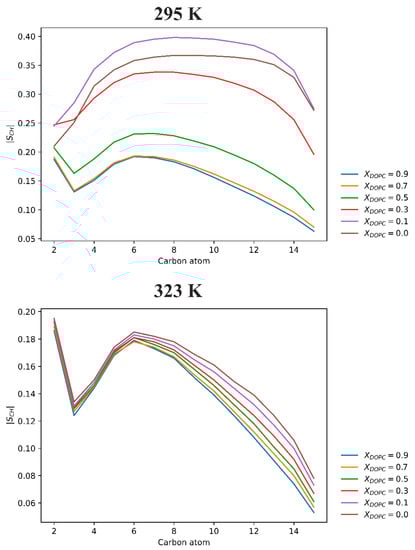 Ordering of lipid acyl chains. The profiles of the hydrogen order parameters (SCH) along the sn-1 chains of DPPC lipids were then calculated as previously described []. Figure 5 shows that, at the higher temperature, the presence of DOPC mainly reduces the ordering of the deeper segments of the DPPC chains (C10–C14 carbons). The effect of the unsaturated lipid on SCH in the upper regions of the mixed bilayer (i.e., the most ordered part of the bilayer) is negligible. On the contrary, at 295 K, the addition of DOPC has a significant impact on the ordering of DPPC hydrocarbon chains. The SCH value strongly decreases as the mole fraction of DOPC increases. The greatest decrease in the ordering of the mixed DPPC/DOPC membrane is observed when XDOPC = 0.3 is exceeded. Interestingly, the addition of 10 mol% DOPC increases the ordering of the DPPC hydrocarbon chains relative to the pure bilayer. This can be explained by the fact that the pure DPPC membrane in our simulations is in the ripple phase (Figure 2), in which some of the lipids show high disorder. The introduction of DOPC causes a partial disappearance of the ripple, and thus an increase in the ordering of the DPPC alkyl chains.