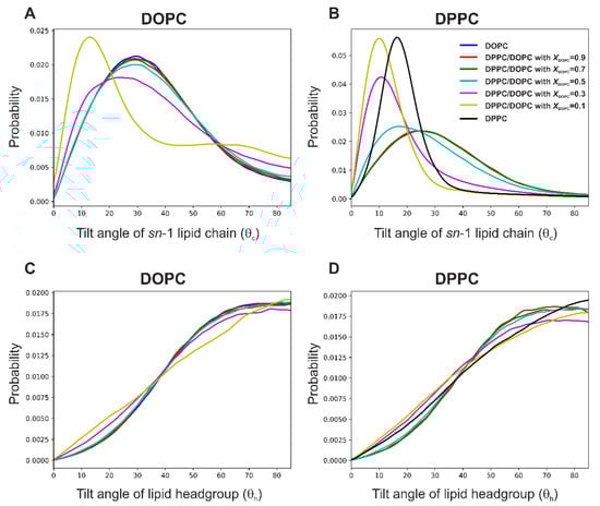 Orientation of lipids in the mixed membrane. In order to describe the arrangement of the lipid molecules inside the mixed membranes, we calculated the tilt angle (θc) between the acyl chains (both sn-1 and sn-2) and the normal to the membrane, and the tilt angle (θh) between the headgroups of DPPC and DOPC lipids and the bilayer normal (see vector definitions in Figure 1). The normalized probability distributions of the angles are shown in Figure 6 and Figure S5 for 295 K and 323 K, respectively.
