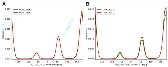 Orientation of headgroups in the mixed membrane. We then focused on the arrangement of the headgroups relative to the entire lipid molecule. Two conformations with different headgroup orientations have been identified in the crystal structure of 1,2-dimyristoyl-sn-glycero-3-phosphatidylcholine (DMPC) by X-ray scattering []. Conformation A shows the headgroup pointing away from the rest of the molecule, while the headgroup in conformation B is folded back, resulting in a more compact structure. These conformations correspond to different orientations of the glycerol moiety in the lipid molecule. The situations where the CG-CG-CG-O dihedral angles (CG stands for carbon from the glycerol moiety) are in gauche and trans configurations are described by the structures A and B, respectively. Figure 7 shows the two conformations adopted by the DPPC molecules in the gel state taken from the MD simulations of the DPPC system. The headgroups can be oriented either above or outside the lipid molecule; however, in both cases, they are arranged almost parallel to the membrane surface. The distributions of the gauche and trans configurations in the equimolar mixture of DPPC and DOPC at 295 K and 323 K are shown in Figure 8. All distributions have three maxima; those at −60° and 60° correspond to the gauche configurations of the CG-CG-CG-O dihedral angles (conformation A), while the maximum at about 180° is associated with the trans configuration (conformation B). Our results show that both lipids have a lot of freedom to change the arrangement of the headgroups, but the trans configuration (with the choline group located above the lipid molecule shielding the hydrophobic part from contact with water) dominates. The contribution of the trans configuration decreases with temperature for both lipids, but this effect is stronger for DPPC.