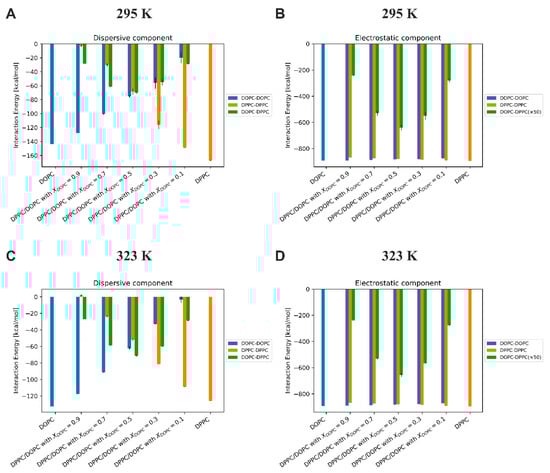 The electrostatic and dispersive components of the interaction energy in the DPPC/DOPC bilayer as a function of the DOPC mole fraction (XDOPC) at 293 K (panels (A,B)) and 323 K (panels (C,D)). All energies were calculated as averages over time and the number of repeats.