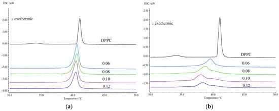 Moreover, at PR25/DPPC and different molar ratios (see Figure 2b), the main peak appears to be composed of two overlapping peaks with a shoulder. This proves that the main phase transition of the phospholipid is less cooperative when lipid is mixed with PR25.