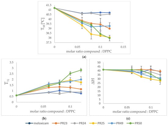 The dependencies of the main transition temperature (TM), the transition peak width at half-height (ΔT½), and the transition enthalpy (ΔH) on the meloxicam analogue/lipid molar ratio obtained for the mixtures of DPPC with studied compounds are shown in Figure 3a–c, respectively.