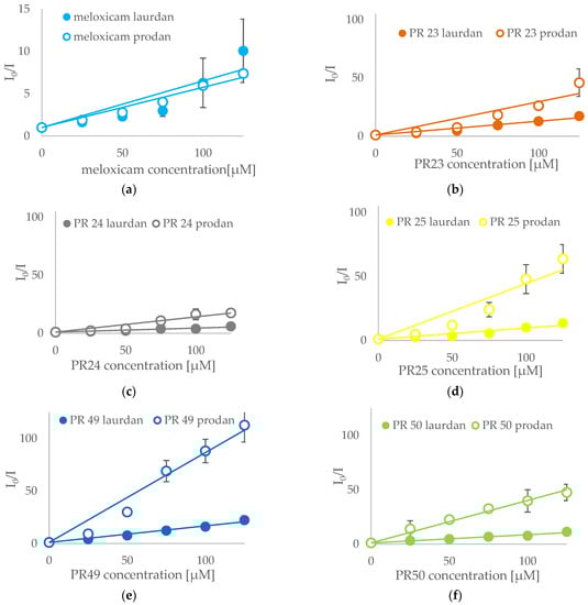 Stern–Volmer plots for: (a) meloxicam (reference compound)-induced quenching of laurdan (full symbols) and prodan (open symbols) fluorescence; (b) PR23-induced quenching of laurdan (full symbols) and prodan (open symbols) fluorescence; (c) PR24-induced quenching of laurdan and prodan fluorescence; (d) PR25-induced quenching of laurdan and prodan fluorescence; (e) PR49-induced quenching of laurdan and prodan fluorescence; (f) PR50-induced quenching of laurdan and prodan fluorescence. Bars represent standard deviations of three independent experiments; where no error bars are shown, they were smaller than the symbols representing the results.