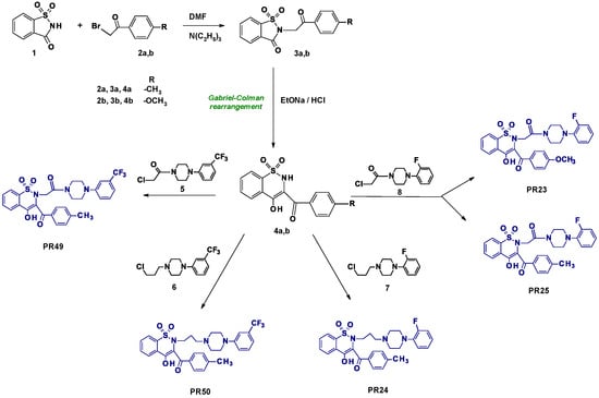 The synthesis pathway of new meloxicam derivatives is presented in Scheme 1. The key starting compound was commercially available saccharine 1, which was condensed with 2-bromo-4′-methylacetophenone 2a or 2-bromo-4′-methoxyacetophenone 2b in a presence of triethylamine in dimethylformamide (DMF) at room temperature. The second step was the Gabriel–Colman rearrangement of compounds 3a and 3b through an opening of 1,2-thiazole ring in the presence of sodium ethanoate and closing with the formation of 1,2-thiazine ring, resulting in compounds 4a and 4b. The next step was the reaction of compound 4a or 4b with an appropriate piperazine derivative 5, 6, 7, or 8 carried out in absolute ethanol with sodium ethanoate under reflux for 10 h. After the synthesis products were isolated from the mixture and crystallized from ethanol, the scheduled meloxicam derivatives PR23, PR24, PR25, PR49, and PR50 were received with approximately 40–50% yields.