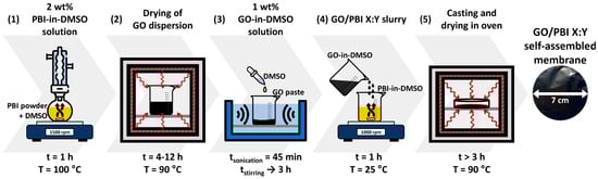 The procedure to prepare the GO/PBI composite membranes was designed on the basis of solution casting techniques described in the literature [5,18,23]. It was composed of five different steps, reported in Figure 1, which are explained hereafter in detail.