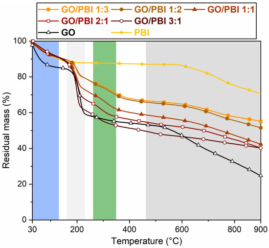 In the end, the fourth stage (dark grey) started at approximately 500 °C. It was related to the breakdown of the GO framework [38], to which the contribution of the partial decomposition of the PBI carbonaceous backbone was added at 600 °C [16,29,49]. Pure PBI demonstrated the largest residual mass at 900 °C (70.5%), such that even the lowest polymer content in GO/PBI 3:1 permitted to have a 15%-heavier residue with respect to pure GO.