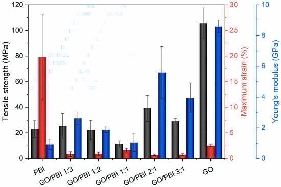 Values of tensile strength (black), maximum strain (red), and Young’s modulus (blue) extrapolated from tensile tests performed on the GO/PBI X:Y composites, pure GO, and pure PBI membranes.