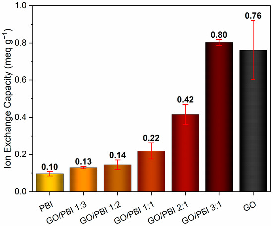 Ion exchange capacity values of the GO/PBI X:Y composites, pure GO, and pure PBI membranes.