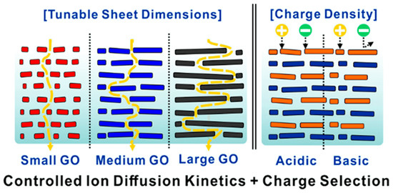 Schematic representation of the ion transport through multilayered GO membranes with differently sized GO building blocks. Reprinted with permission from [102]. Copyright 2020 American Chemical Society.