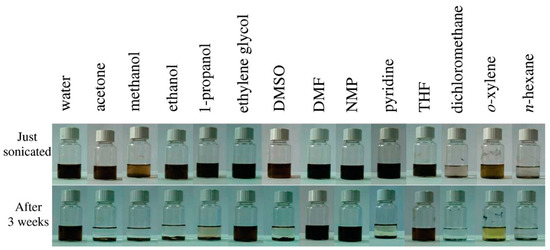 GO dispersion in a range of solvents immediately after sonication (top) and after settling for 3 weeks (bottom). Reprinted with permission from [110]. Copyright 2020, American Chemical Society.