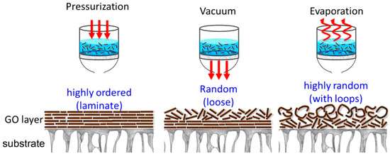 Pressure-assisted filtration is a technique involving the use of a pressure source to force a liquid to pass through a membrane while retaining the solid particles [95,103,134,171,172,173]. Similarly to what happens with vacuum filtration, the apparatus commonly consists of a tank connected to a pressure source and filled with the solution. At the bottom of the tank, a membrane is placed. The pressurized gas forces the water to pass through the membrane, while the liquid exits from an outlet. As for vacuum filtration, the driving force is the pressure difference between the two sides of the membrane. If a GO solution is poured inside the tank, an analogous result is obtained, with the GO flakes stacking on the surface of the support membrane, forming the GO membrane. The pressure-assisted filtration is reported to be a valid alternative to vacuum filtration and to produce membranes even more ordered than those prepared by vacuum filtration (see Figure 7).