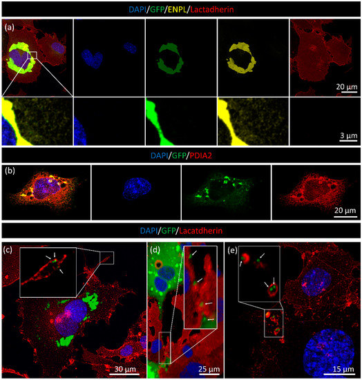 - Mathieu, M.; Névo, N.; Jouve, M.; Valenzuela, J.I.; Maurin, M.; Verweij, F.J.; Palmulli, R.; Lankar, D.; Dingli, F.; Loew, D.; et al. Specificities of exosome versus small ectosome secretion revealed by live intracellular tracking of CD63 and CD9. Nat. Commun. 2021, 12, 4389. [Google Scholar] [CrossRef]
