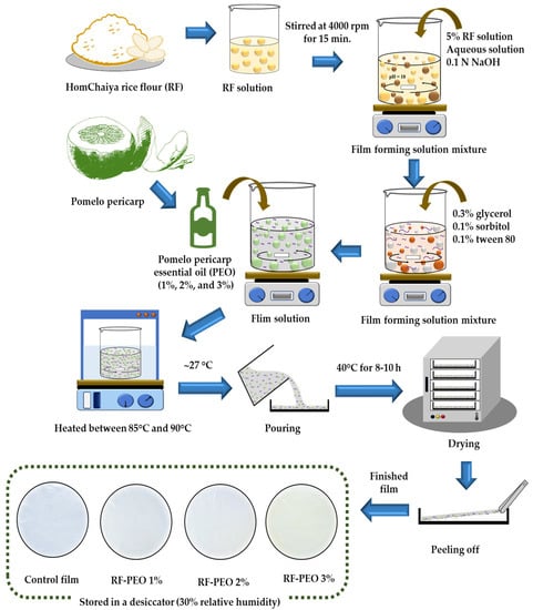The RF films were prepared using a casting technique based on the method of Dias et al. [] with some modifications. To prepare the edible film, 5% RF (5 g) was mixed with distilled water (pH 10, adjusted using 0.1 N NaOH). The mixture was continuously stirred at 4000 rpm for 15 min. Next, plasticizers including 0.3% glycerol (0.3 g), 0.1% sorbitol (0.1 g), and 0.1% Tween 80 (0.1 g) were added to the film-forming solution, followed by the addition of pomelo pericarp essential oil (PEO) at different concentrations (1%, 2%, and 3%, corresponding to 1.0, 2.0, and 3.0 g, respectively). The volume of the distilled water was adjusted to maintain a total volume of 100 mL for each essential oil concentration (94.5 mL for 0% (control), 93.4 mL for PEO 1%, 92.3 mL for PEO 2%, and 91.2 mL for PEO 3% essential oil, respectively). The mixture was then heated to between 85 °C and 90 °C using a thermal water bath and continuously stirred for an hour to initiate starch gelatinization. The temperature of the film-forming solution was brought down to ambient conditions (~27 °C) and poured homogeneously onto plexiglass plates. Then, the film solutions on the plates were dried at 40 °C for 8–10 h in a hot air oven. The films were peeled off of the plexiglass plates and stored in a low-density polyethylene (LDPE)-based Ziplock bag in a desiccator at ambient temperature with 30% relative humidity. The RF films with PEO at different concentrations were designated as treatments and named as follows: RF-PEO 1%, RF-PEO 2%, and RF-PEO 3%. The infographic of the preparation of RF-PEO films is shown in Figure 1. All films in this study were subjected to various determinations as described below.
