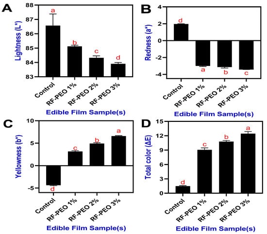 Color characteristics (L* (A), a* (B), b* (C) and ΔE (D)) of edible films made of RF-PEO at varying concentrations. The different letters of the alphabet shown on the bar diagram indicate significant differences.